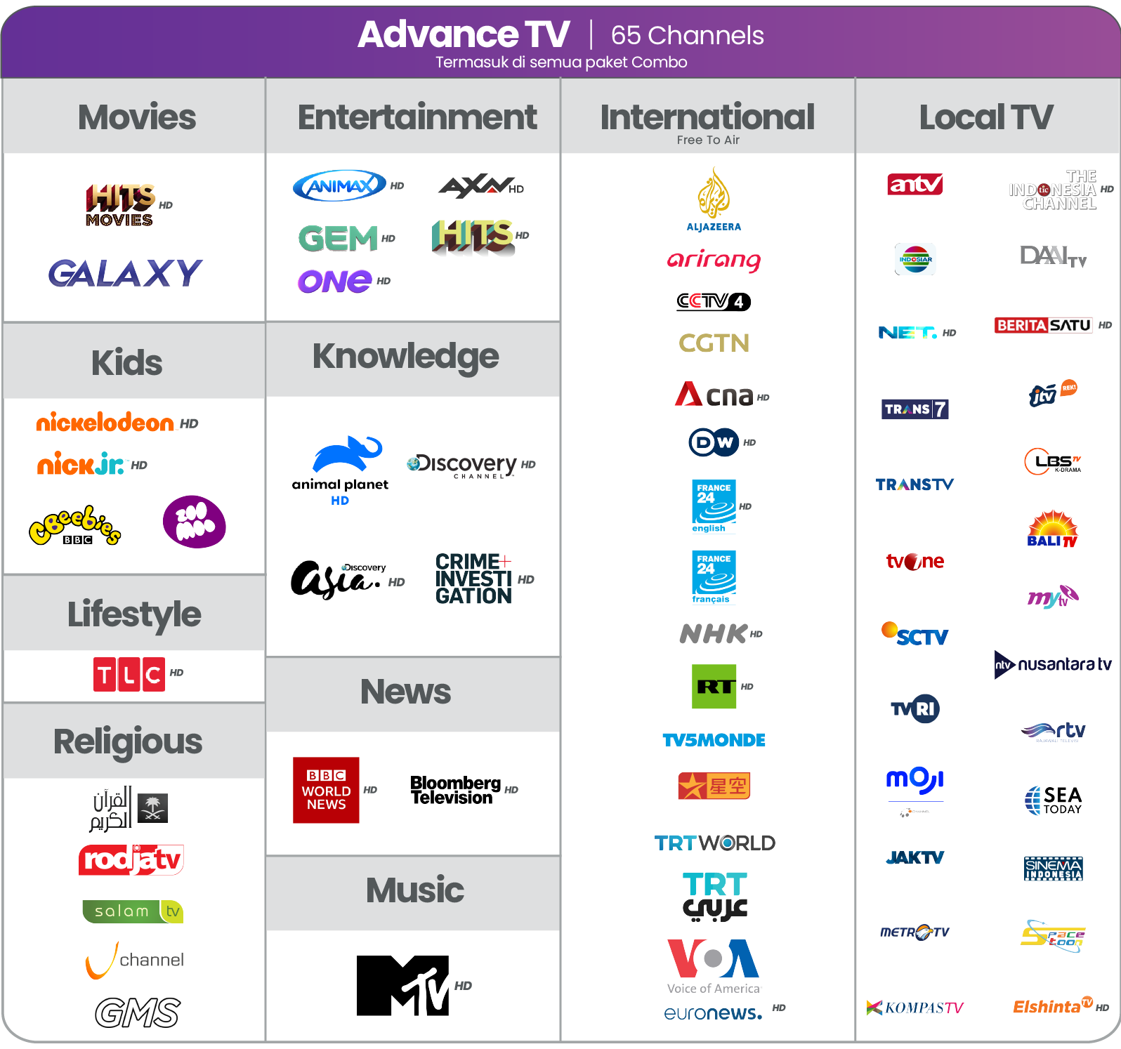 Bebas tonton acara apapun yang kamu mau. Puluhan channel lokal dan internasional kualitas HD akan menemanimu sepanjang waktu.